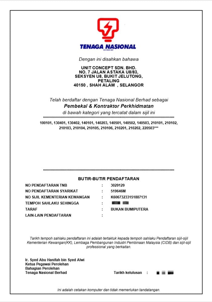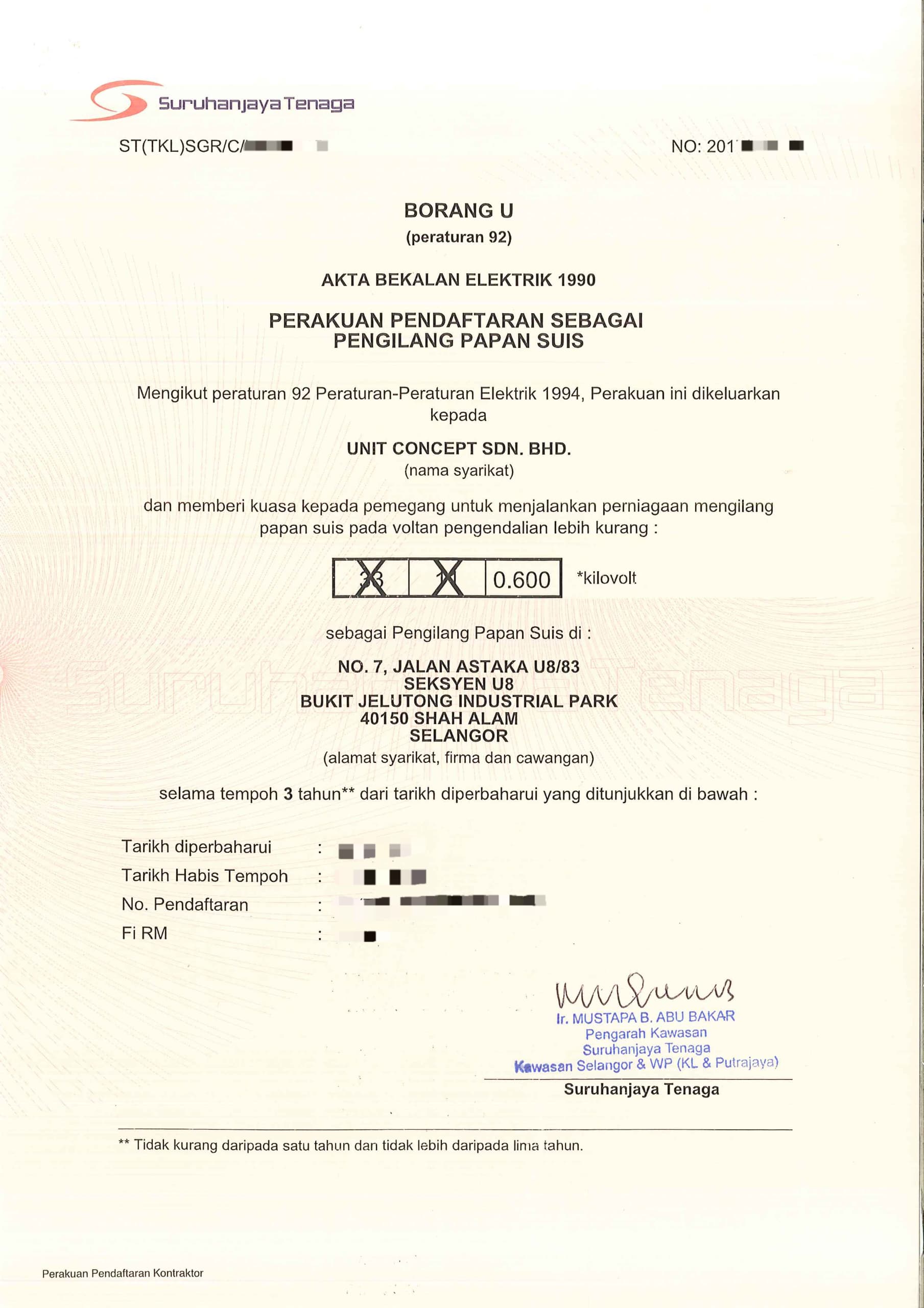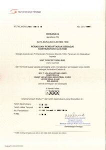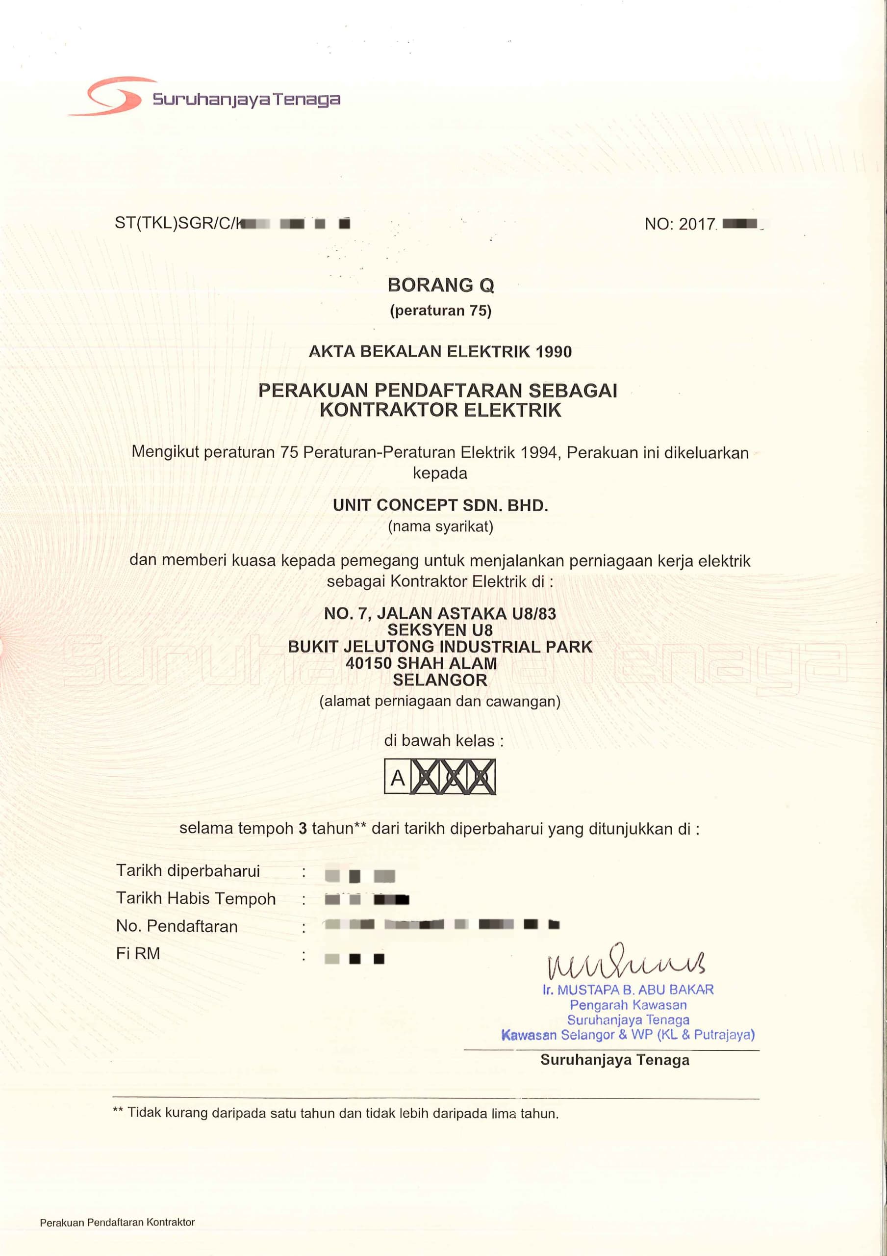 • Electrical Contract Class A Endorsed by Suruhanjaya Tenaga
